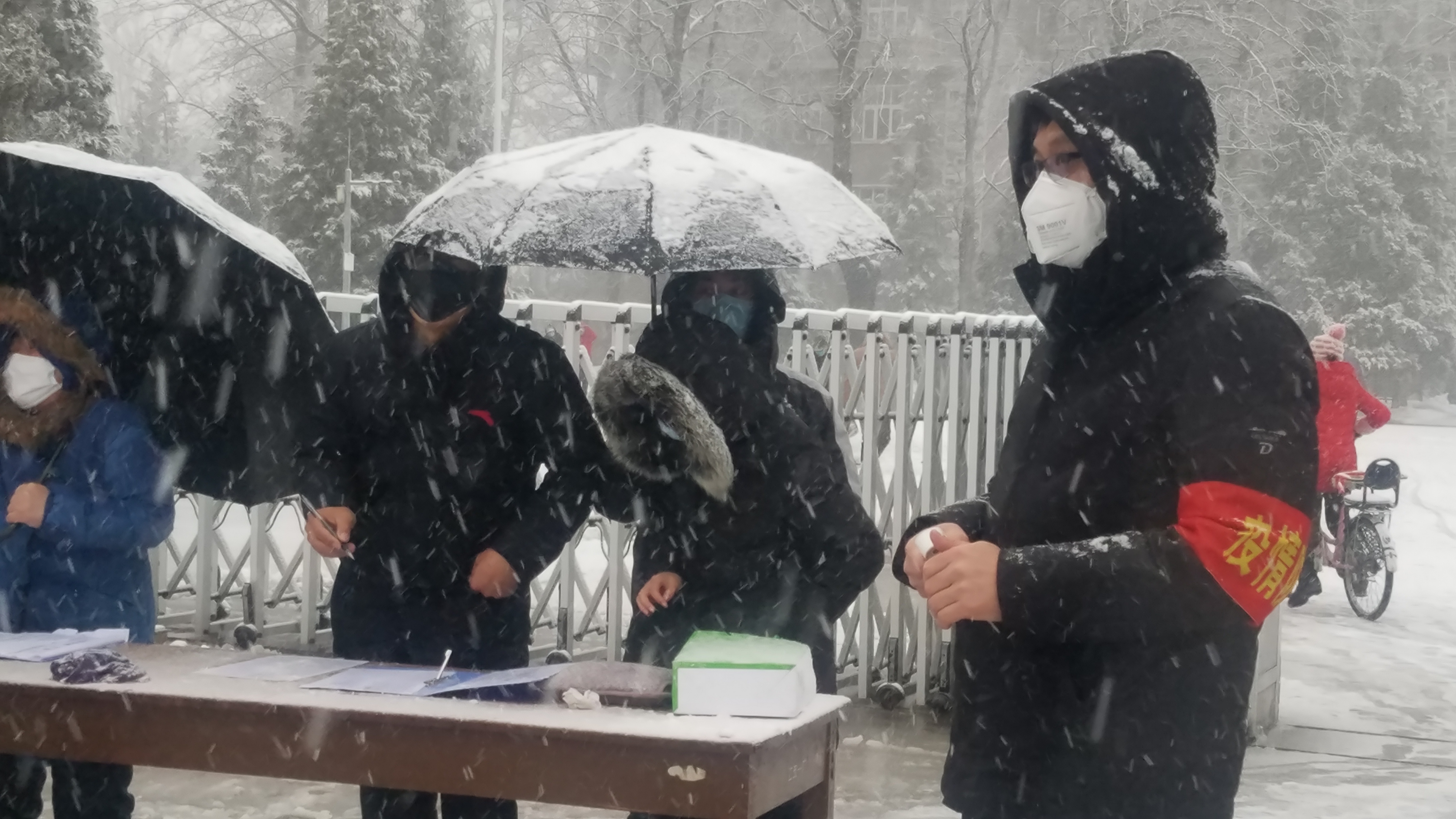 - 2月14日,一場雪雨突如其來,北風(fēng)伴著春雨,低溫連著雨雪,天地瞬間變成銀裝素裹,面對氣溫驟降、雪雨交加的惡劣天氣,北玻院廠區(qū)疫情防控點(diǎn)的黨員干部不畏雪雨,依然同往常一樣堅守崗位,嚴(yán)防嚴(yán)控,認(rèn)真有序?qū)挝粏T工進(jìn)行上崗前測溫與登記,筑牢織密疫情防控網(wǎng),雪雨淋濕了他們的衣裳,毫無顧忌,他們說,防控就是責(zé)任,身為一名黨員,關(guān)鍵時刻我們要走在疫情防控的最前沿,不管天氣有多惡劣,我們一定值好班、站好崗,把好關(guān)。初心在風(fēng)雪中堅守,使命在嚴(yán)寒中擔(dān)當(dāng),他們沒有別的奢求,只希望用自己的努力守護(hù)著員工的安康。此時此刻,望著他們迎雪雨、戰(zhàn)嚴(yán)寒、嚴(yán)排查的身影,頓生敬意與感動,他們就是雪雨中防控疫情最美的風(fēng)景線,有他們的堅守、奉獻(xiàn)與擔(dān)當(dāng),北玻院一定能打贏疫情防控阻擊戰(zhàn)。